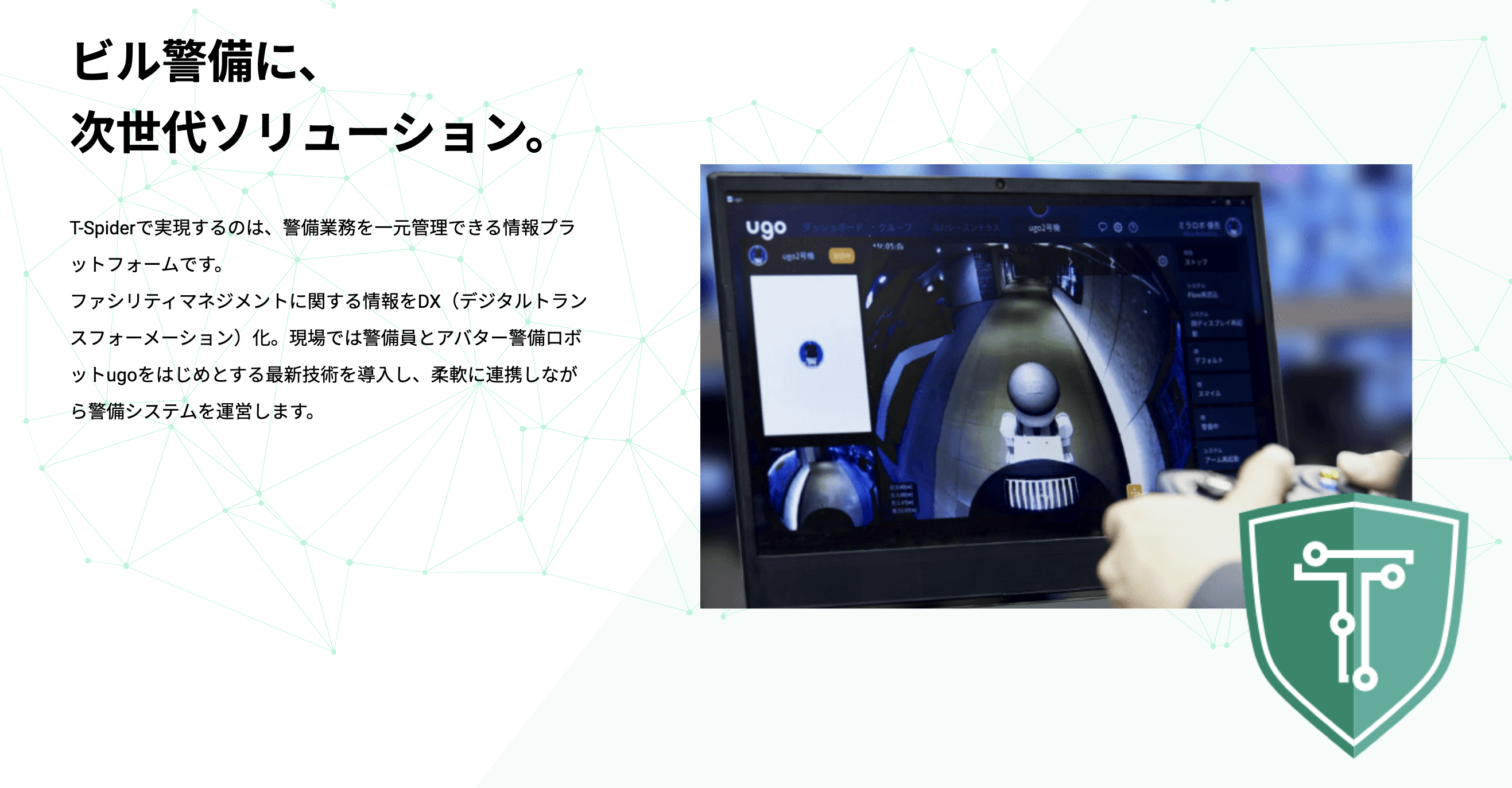ファシリティマネジメントに関する情報をDX化し、一元管理できるプラットフォームを構築を行い、これまで人が行なっていた業務の一部を、ロボットなどの機器に置き換え警備業務の効率化と質の向上を実現するサービス。T-SpiderのWEBサイトを制作致しました。
